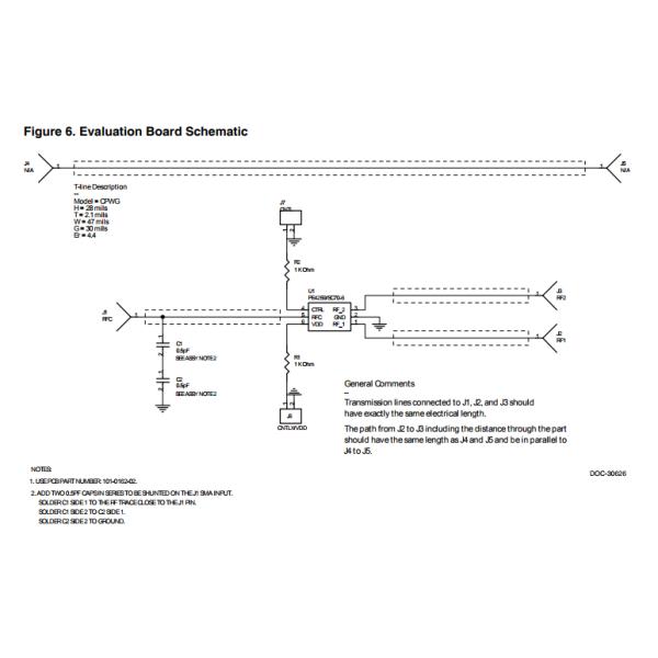 Evaluation Kit The SPDT switch EK Board was designed to ease customer evaluation of Peregrine’s PE4259. The RF common port is connected through a 50Ω transmission line via the top SMA connector, J1. RF1 and RF2 are connected through 50Ω transmission lines via SMA connectors J2 and J3, respectively. A through 50Ω transmission is available via SMA connectors J4 and J5. This transmission line can be used to estimate the loss of the PCB over the environmental conditions being evaluated. The board is constructed of a two metal layer FR4 material with a total thickness of 0.031”. The bottom layer provides ground for the RF transmission lines. The transmission lines were designed using a coplanar waveguide with ground plane model using a trace width of 0.0476”, trace gaps of 0.030”, dielectric thickness of 0.028”, metal thickness of 0.0021” and εr of 4.4. J6 and J7 provide a means for controlling DC and digital inputs to the device. J6-1 is connected to the device VDD or CTRL input. J7-1 is connected to the device CTRL input